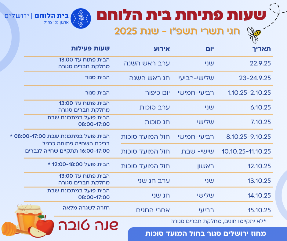 ראו שעות פתיחה של בית הלוחם ירושלים בתקופת חגי תשרי תשפ"ו: